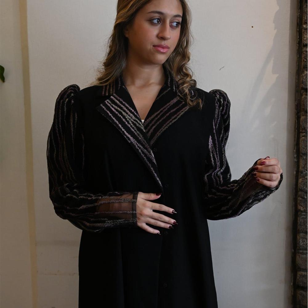 - تفاصيل فاخرة: تطريز دقيق على الياقة والأكمام يضيف لمسة بريق أنيق.