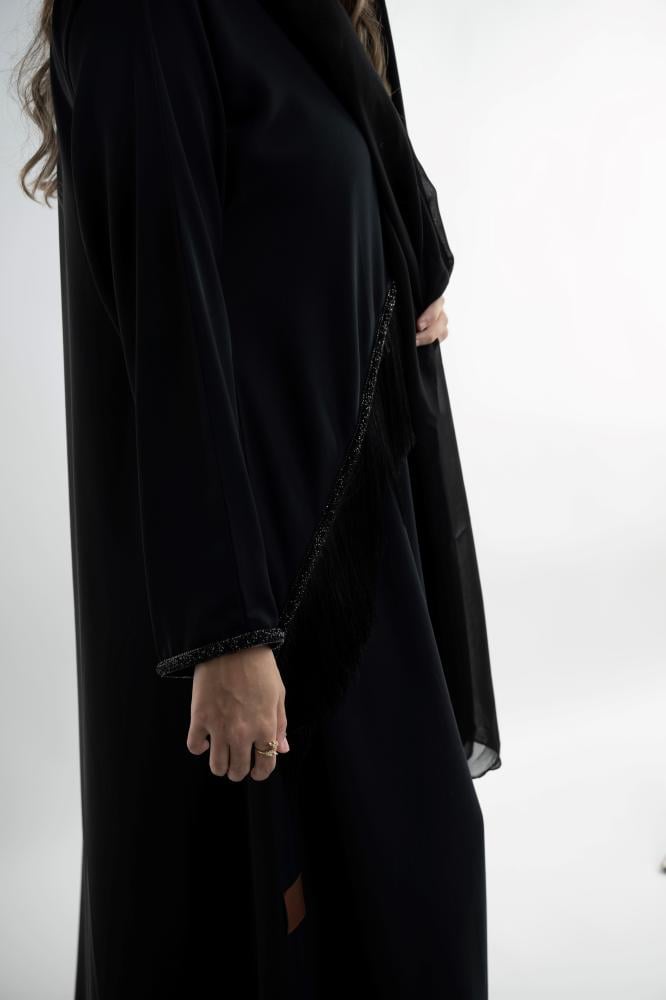 اختاري الأناقة في كل مناسبة مع عبايه مطرزه بالخرز كريب سوداء بتفاصيل فاخرة على الحواف والأكمام مع شرّابات أنيقة تضيف لمسة فخمة وانسيابية مثالية للسهرات والمناسبات الخاصة.