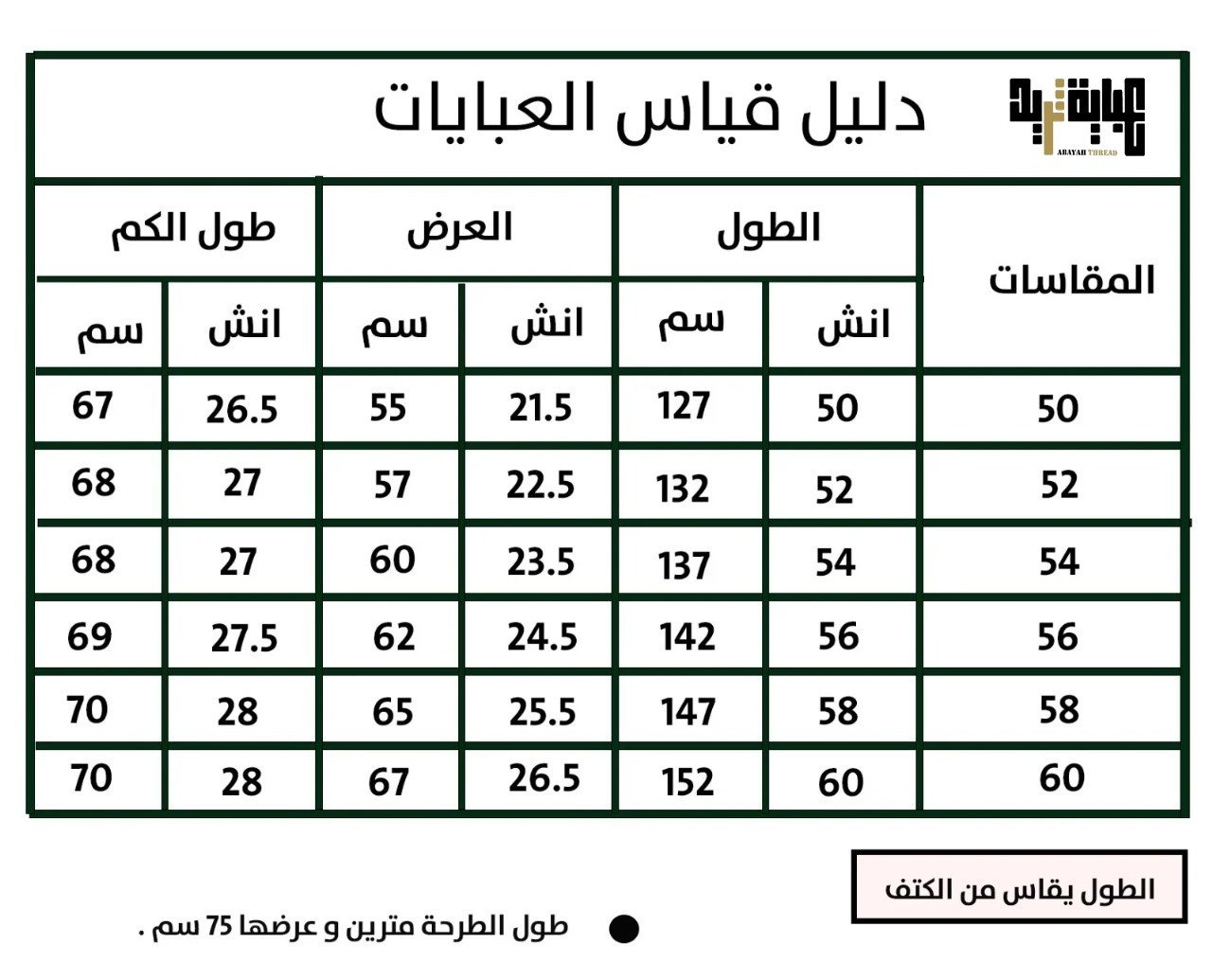 - الطول 152 سم : العرض 67 سم، وطول الكم 70 سم، والمقاس المثالي للعباية هو 60.